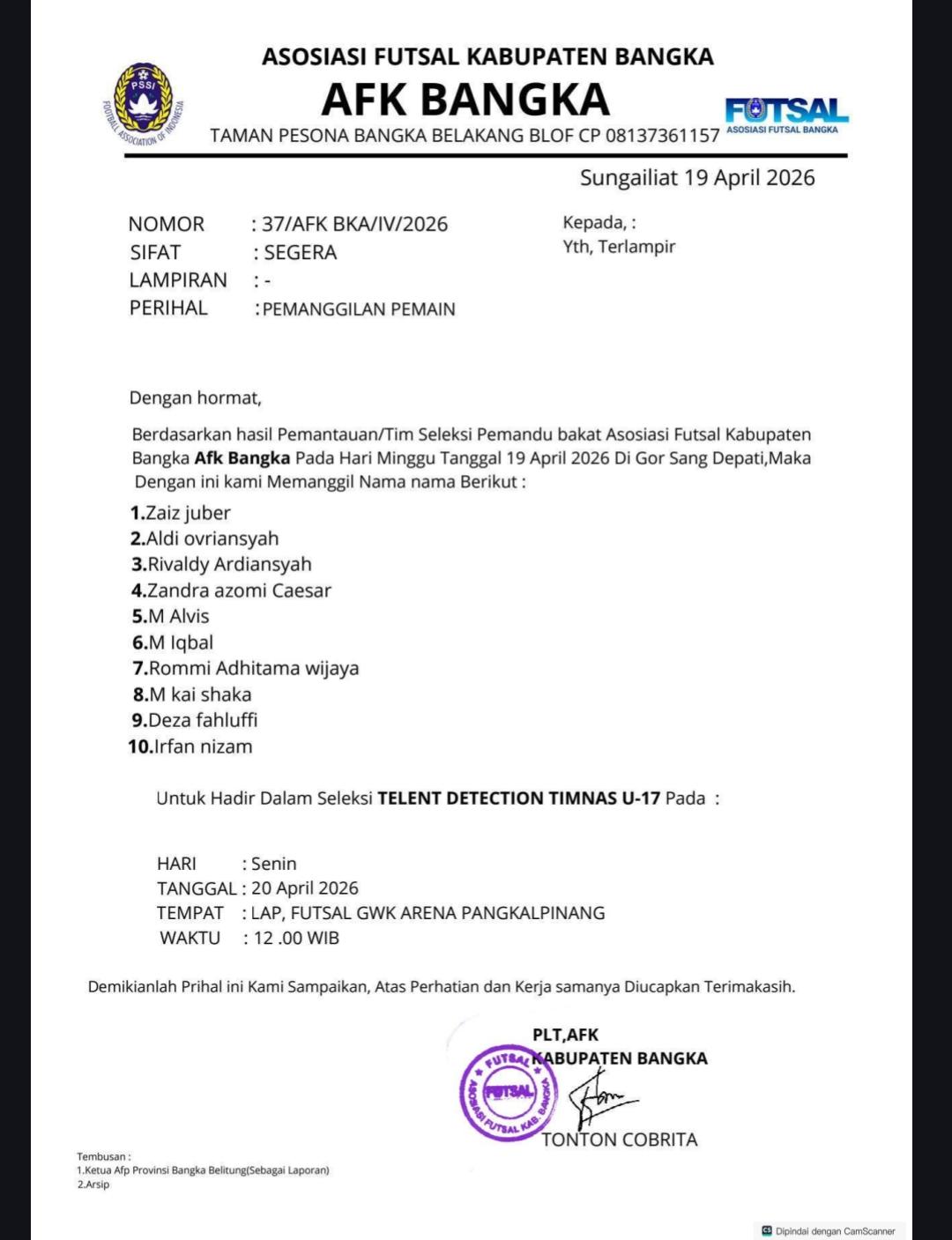 http://JURNALSIBER.COM (Sungailiat) – Alhamdulillah, kabar membanggakan datang dari MTs PBu Islamic Center Sungailiat, Bangka. Lima santri sekolah ini berhasil lolos seleksi pemanggilan pemain untuk Timnas U-17 tingkat Kabupaten Bangka yang diumumkan oleh Asosiasi Futsal Kabupaten Bangka (AFK Bangka) pada 19 April 2026.