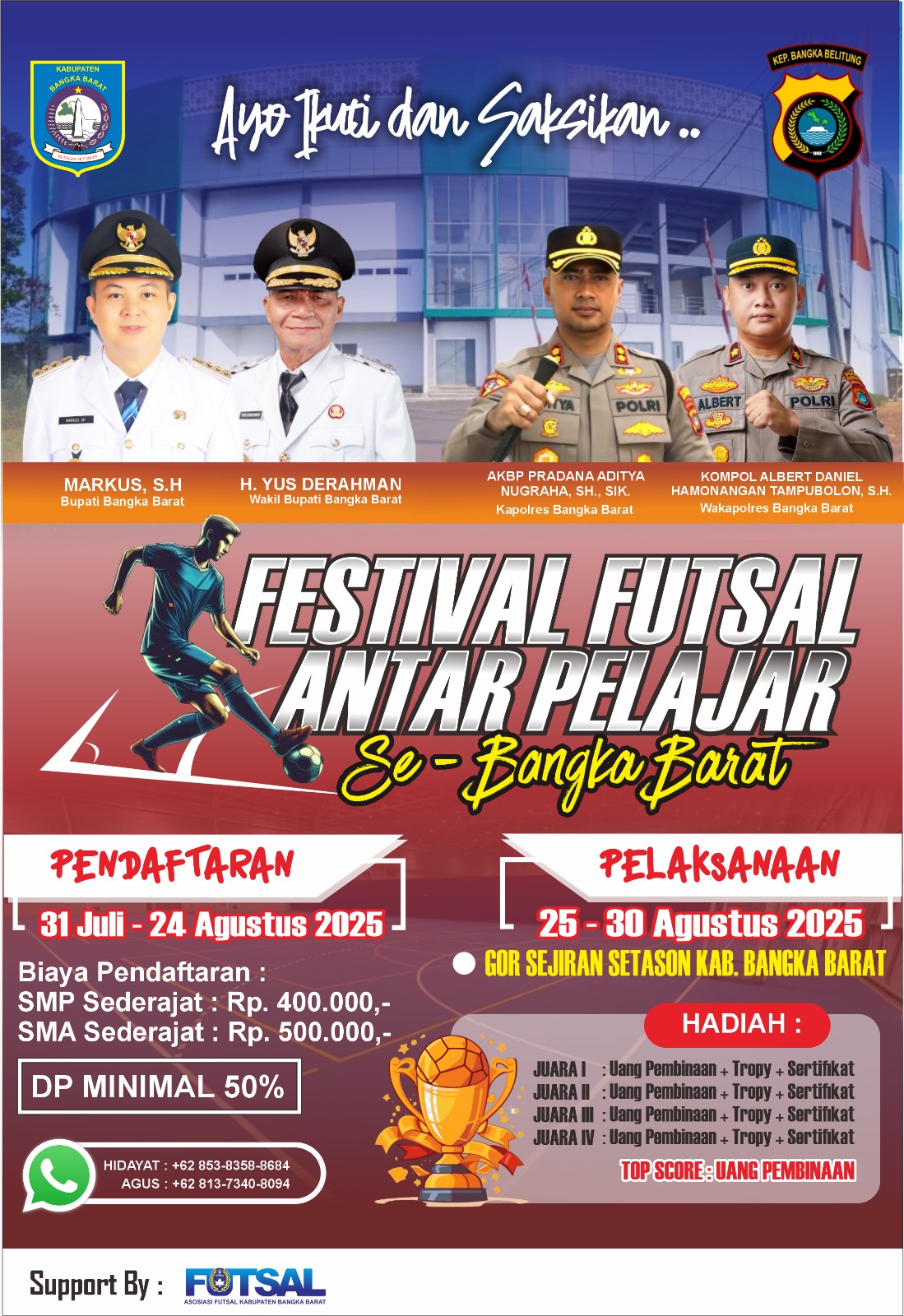 Mentok-Semangat membina generasi muda melalui kegiatan positif, Pemerintah Kabupaten (Pemkab) Bangka Barat bekerja sama dengan Kepolisian Resor (Polres) Bangka Barat menggelar Festival Futsal Antar Pelajar se-Bangka Barat. 16/08/25