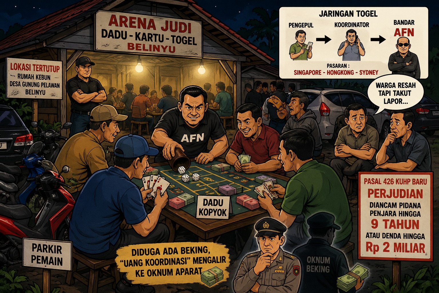 Secara hukum, aktivitas tersebut jelas melanggar ketentuan pidana sebagaimana diatur dalam KUHP terbaru, yang mengancam pelaku, pengelola, hingga bandar judi dengan hukuman penjara maksimal sembilan tahun atau denda hingga miliaran rupiah.