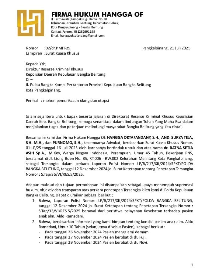 *PANGKALPINANG —* Kasus dugaan maladministrasi medis yang menjerat dr. Ratna Setia Asih, Sp.A., M.Kes, terus menuai sorotan. Firma Hukum Hangga, yang mewakili dr. Ratna, resmi mengajukan permohonan pemeriksaan ulang perkara sekaligus otopsi terhadap jenazah pasien alm. Aldo Ramadani (10). Kamis (14/8/2025)