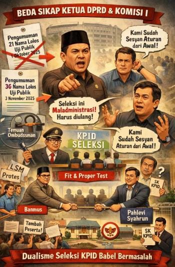 “Masalah ini bermula ketika DPRD Babel sudah mengumumkan 21 nama yang lolos ikut uji publik sebelum fit and proper test. Pengumuman 21 nama itu adalah hasil dari perankingan yang dilakukan Komisi I, berdasarkan data dari panitia seleksi. Lalu, setelah ada yang protes, Ketua DPRD Babel membuat pengumuman lagi, sebanyak 36 orang ikut uji publik, dengan nomor surat yang sama dengan pengumuman 21 orang sebelumnya,” terang Muri, Jumat (19/12/2025).