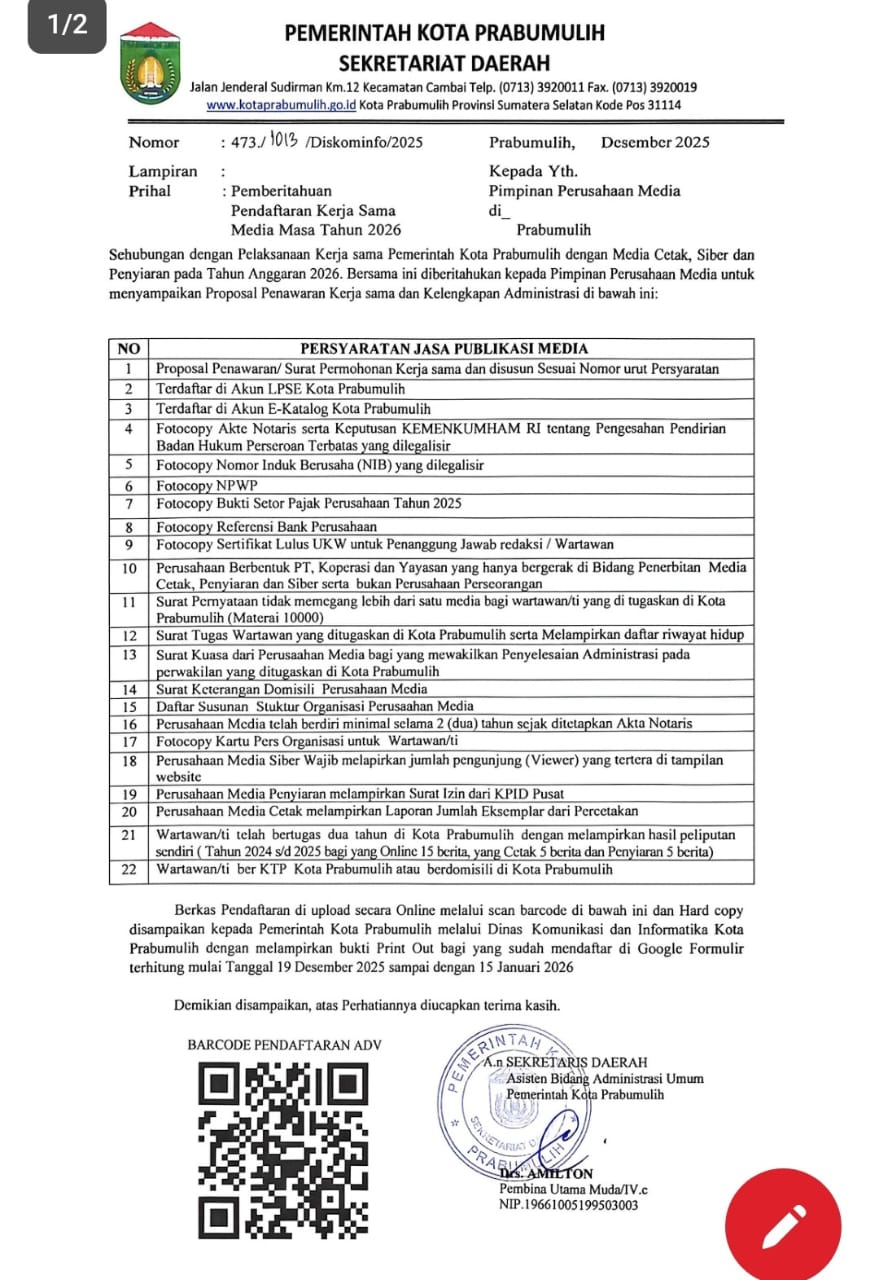 Pemerintah Kota Prabumulih melalui Sekretariat Daerah resmi membuka pendaftaran kerja sama publikasi dengan perusahaan media massa untuk Tahun Anggaran 2026. Kebijakan ini mencakup media cetak, siber (online), dan penyiaran.