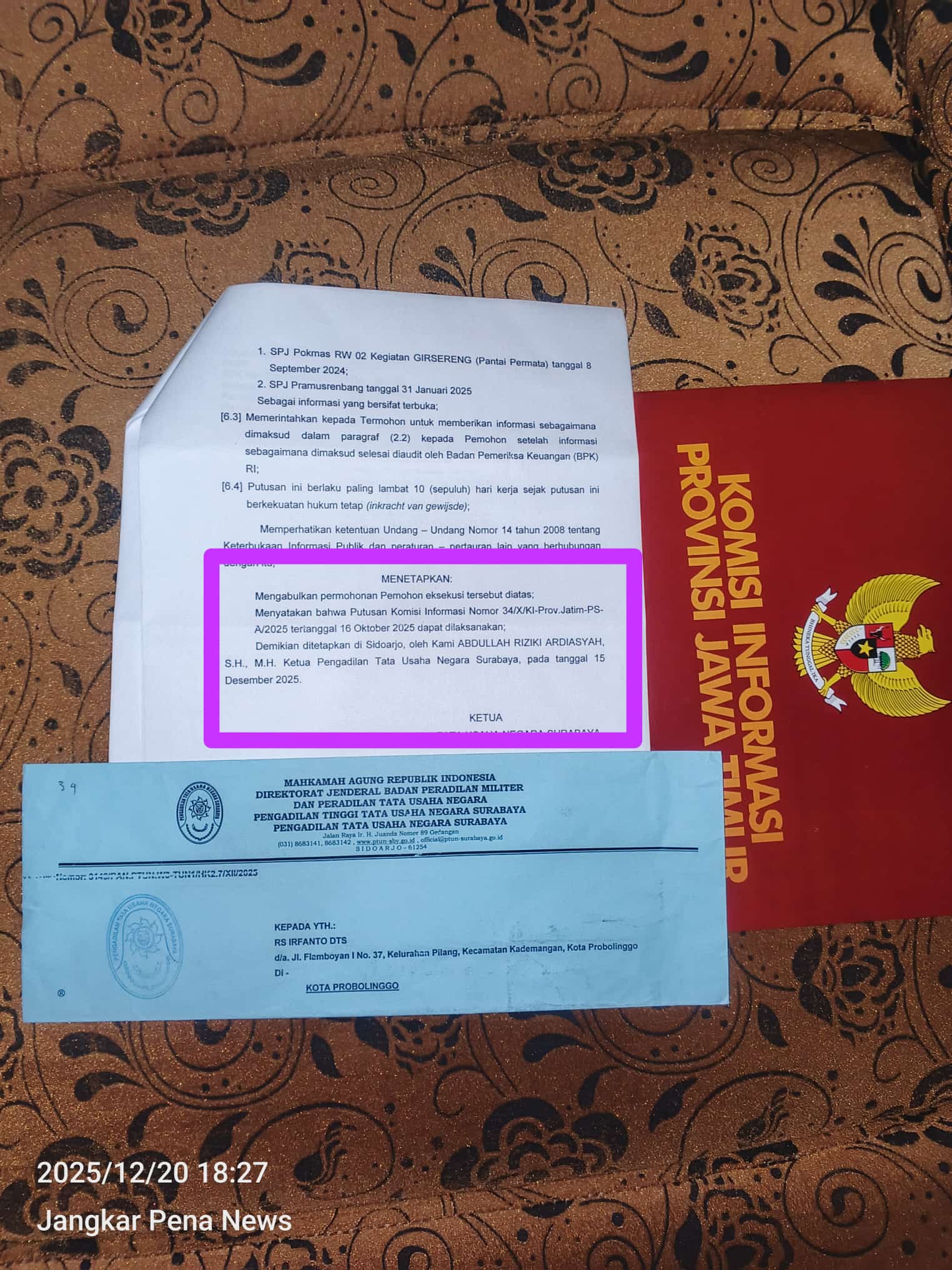 Probolinggo, 20 Desember 2025 – Jangkar Pena: Pengadilan Tata Usaha Negara (PTUN) Surabaya telah mengabulkan permohonan eksekusi yang diajukan oleh warga Kelurahan Pilang, Kecamatan Kademangan, Kota Probolinggo terhadap Pejabat Pengelola Informasi dan Dokumentasi (PPID) Kota Probolinggo. Permohonan ini terkait penolakan PPID untuk memberikan Surat Pertanggungjawaban (SPJ) kegiatan Festival Gir Sereng yang digelar pada 8 September 2024 dan SPJ Pramusrenbang yang diselenggarakan pada 31 Januari 2025.