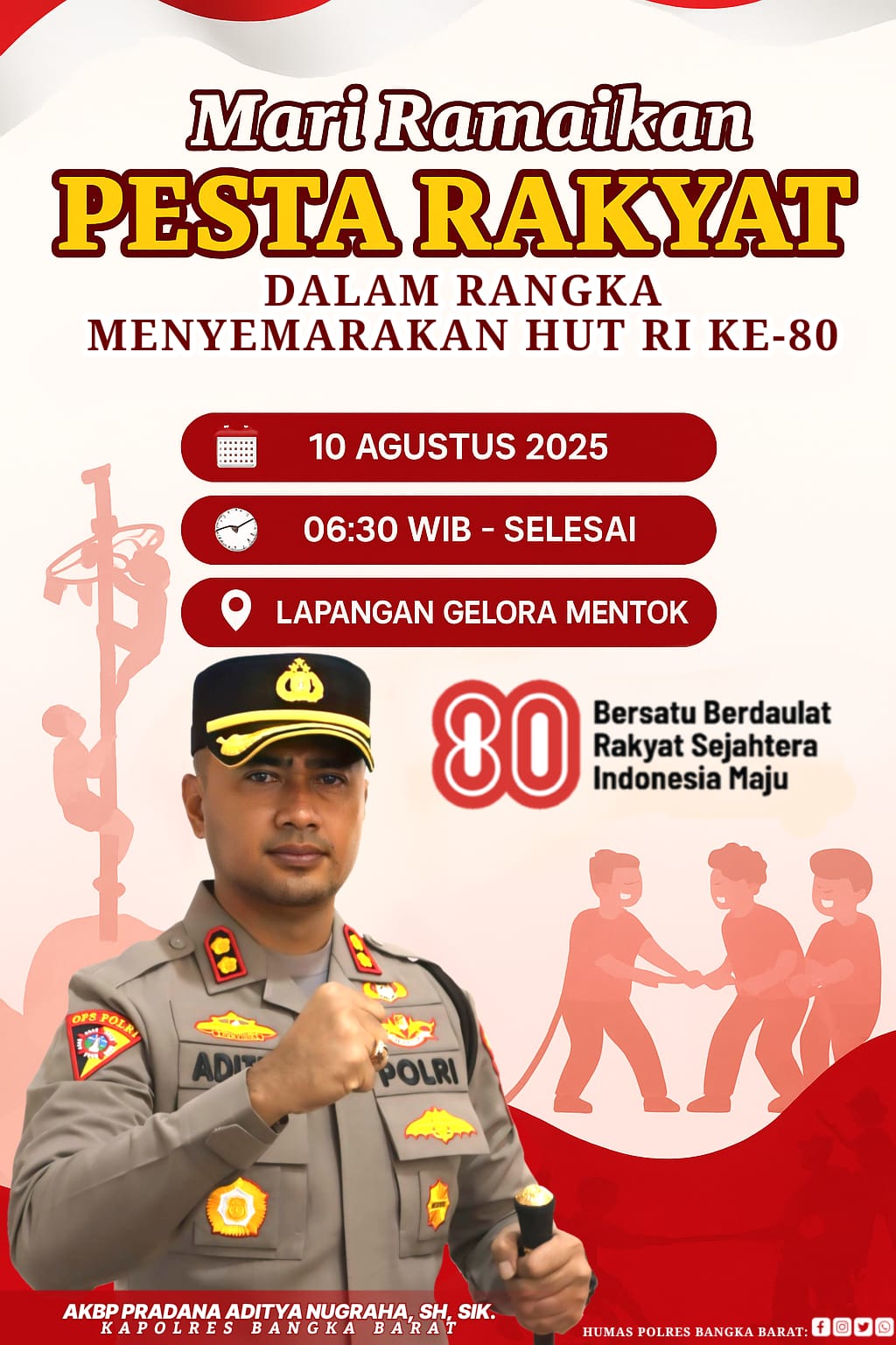 Dalam rangka memperingati Hari Ulang Tahun Republik Indonesia ke-80, Polres Bangka Barat akan menggelar Pesta Rakyat yang terbuka untuk seluruh lapisan masyarakat.